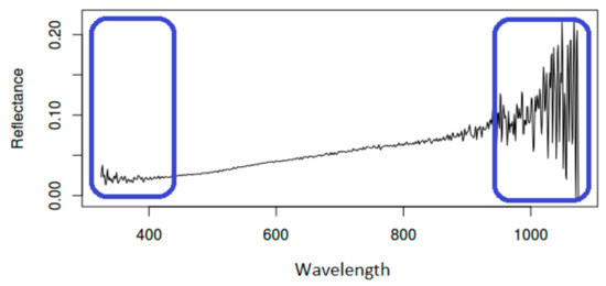 Reflectance data collected with FieldSpec HandHeld2 portable spectrometer on 22 test sites were processed to remove the influence of the noise on the developed model. These marginal spectral range values vary from device to device. For FieldSpec HandHeld2, excessive noise was experimentally determined to affect the measured signal with a wavelength of less than 450 nm and greater than 950 nm, as shown in Figure 3. Nawi et al. [39] and Grant [40] also recommended removal of reflectance values in the wavelength range less than 600 nm and above 1000 nm and less than 450 nm and greater than 950 nm, respectively, to reduce the influence of the noise on measured data.