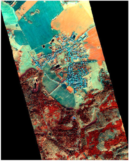 The FLIS consists of an aircraft-mounted set of three hyperspectral sensors from ITRES, Ltd. [34], two of which (CASI-1500 and SASI-600) collected data for the study. The CASI-1500 is a visible near-infrared (vis-NIR) sensor that offers 1500 pixels across its field of view, and a spectral range between 380 and 1500 nm with resolution better than 3.2 nm. The hyperspectral SASI-600 sensor captures 100 spectral channels across the shortwave infrared (SWIR) spectral region between 950 and 2450 nm with 600 across-track imaging pixels. The spatial pixel resolution for CASI-1500 and SASI-600 sensors is 1.5 m and 2.5 m, respectively, based on a 40-degree field of view and flight altitude of 2060 m. Radiometric calibration, an atmospheric correction, the exclusion of water absorption bands, and the georeferencing of the hyperspectral images were carried out by CzechGlobe to derive nadir normalized ground reflectance. Furthermore, as part of the pre-processing steps, the data from the two sensors were joined into the final hyperspectral image.