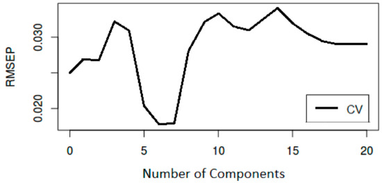 The most critical step of the entire process was building the model, because the resulting values depend on the character of the model. Furthermore, the precision and accuracy of the prediction are dependent on the quality of input data, which often cannot be influenced, and on the quality of the developed model. Due to the relatively small size of the dataset (total of 22 samples), the standard procedure of dividing the entire dataset into the training set and validation set was not implemented, and the entire dataset was used to build the model. Validation of the developed model was performed using only the cross-validation method. During the model development, an iterative process of leave-one-out cross-validation was used. It sequentially hides one value from the dataset, tests the quality of its prediction with the remaining values, returns the value into the dataset, and then selects another value and hides it. Since the dataset was not extremely large, the model was built with a maximum number of latent variables. The PSLR function then calculated the RMSEP for the different number of latent variables, as seen in Figure 5.