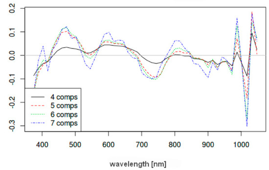 Regression vectors in Figure 7 show that the use of seven components contributes to the prediction, but this contribution is not significant and, according to cross-validation (Figure 8), there is a slight deterioration in the prediction ability. Although the use of seven components would not be wrong, only six were used to avoid over-fitting the model and, as a result, increasing the noise.