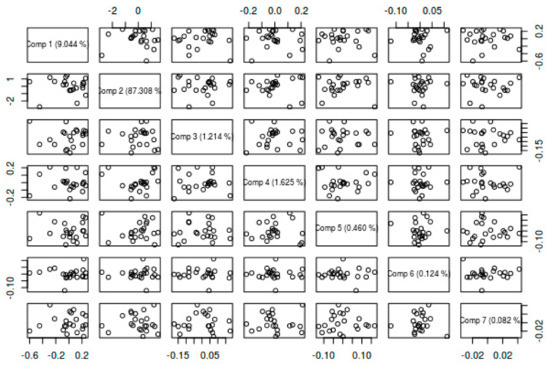 The decision to use six components is also supported by a score graph (Figure 8), which shows the variance of the data that make up the main components [46]. It is possible to read the variance of data between individual components from this graph. The most important component forming the model itself was the second component, explaining 87% of the problem relevant variance in the data. This is a rather surprising result because for most models built this way, the most important component is the first one. The sixth component is the most important for the second part of modeling and prediction. The values described by the sixth component are the values with the least variance and, except for two outliers, describe the data very well.