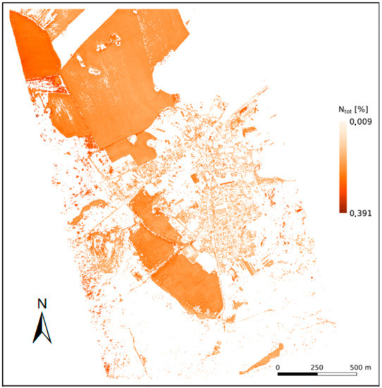 The last step involved a process of removing pixels that do not logically correspond to the possible soil properties values and determining the bare soil to which the resulting data should correspond. The acquired raster for total nitrogen content also showed a certain number of negative values (Table 1). This is logically impossible because the investigated quantities cannot have negative numbers. Therefore, these pixels were also removed to preserve only the portion of the raster with relevant data.