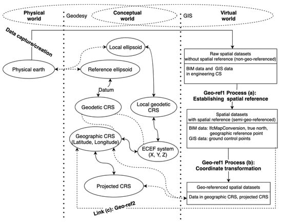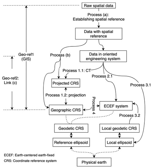 In most of the cases, geographic information systems (GISs) use a coordinate reference system (CRS) [1], either geodetic CRS or projected CRS, to integrate heterogeneous spatial data, i.e., any data that are related to a location [2], such as satellite images, contour data, a digital elevation model (DEM), and other vector or raster data from, e.g., 3D metric survey. The CRS serves as a locating frame in a GIS for heterogeneous spatial datasets that are linked to different spatial locations. Therefore, datasets to be managed and analyzed in a GIS have to be geo-referenced.
