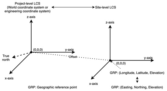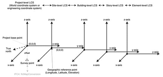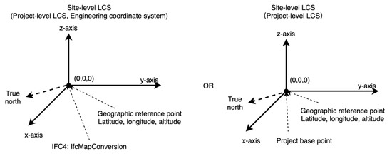 The following facts are concluded from IFC specifications. (1) IfcProject is the highest geometry container in the IFC, sites are placed in the project-level LCS defined by the WorldCoordinateSystem, and the ‘project base point’ refers to the origin of the project-level LCS. (2) In IFC4, IfcMapConversion is related to the ‘survey point’, while IFC geometry is related to the ‘project base point’. These two points are preferred to be coincidental, but it is possible to offset them, in which case, the offset is indicated by the WorldCoordinateSystem. (3) The project-level LCS is also known as the world coordinate system or the engineering coordinate system in the IFC, which by itself is not related to the real world. (4) The geographic reference point is for the origin of the site-level LCS. (5) When IfcMapConversion is defined, the true north, if defined, is only for informational purposes [48].