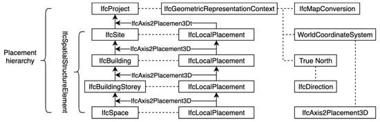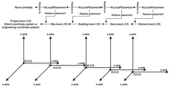 The IFC adopts a relative placement system (element→storey→building→site→project, see Figure 5), referred to as placement hierarchy, where an object (child) is placed in relation to an upper class (parent) in the placement hierarchy [44,45]. For example, a building is placed relative to a site. Each object has its own LCS with an origin of (0, 0, 0), and orientation of (1, 0, 0), (0, 1, 0) and (0, 0, 1) for the x-axis, y-axis, and z-axis, respectively. The relative placement between adjacent LCSs is indicated in the IfcLocalPlacment entity, which has two attributes, i.e., PlacementRelTo and RelativePlacement. The PlacementRelTo points to another IfcLocalPlacment object which is for the parent class. If the PlacementRelTo points to null, it means that this object is placed in the project-level LCS (world coordinate system) [46]. The RelativePlacement points to a IfcAxis2Placement3D object, which records the origin shift (IfcAxis2Placement3D.Location) and orientation of the child LCS (IfcAxis2Placement3D.Axis for z-axis and IfcAxis2Placement3D.RelDirection for x-axis) in the parent LCS. Through IfcAxis2Placement3D, coordinates in the child LCS can be transformed into the parent LCS [44].
