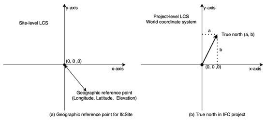 IfcSite is the IFC entity representing a construction site [47], which defines a geographic reference point for the origin of the site-level LCS, (0, 0, 0), using geographic coordinates (longitude, latitude, elevation) in WGS84, as shown in Figure 6a. IfcGeometricRepresentationContext is the most important attribute of IfcProject for geo-referencing [48]. It defines the context that applies to shape representations within a project and includes two attributes that are essential to establishing spatial referencing, i.e., TrueNorth and WorldCoordinateSystem.
