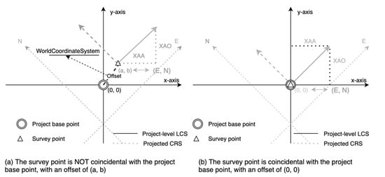 According to these definitions, it can be concluded that the WorldCoordinateSystem is supplementary to IfcMapConversion and should be considered during geo-referencing only when the survey point is different from the project base point in IFC4, as shown in Figure 7a. When this happens, the offset between them is defined in the WorldCoordinateSystem. The situation where these two points coincide is presented in Figure 7b.