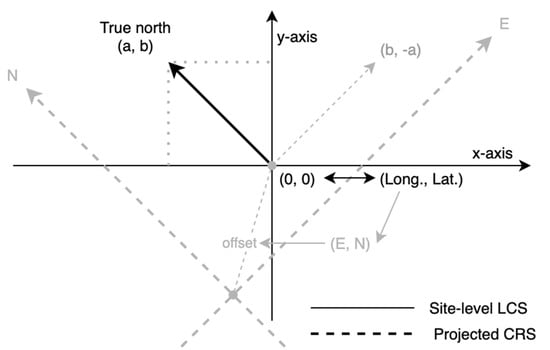The transformation matrix and the origin shift can be obtained by using the relationship between the site-level LCS and the projected CRS, as presented in Figure 10. The solid x-axis and y-axis constitute the site-level LCS, and their intersection is the origin of the site LCS with local coordinates of (0, 0). The solid arrow in the second quadrant of the site LCS points to the true north, , or the direction of the N-axis (north) of the underlying projected CRS. Once the N-axis is determined, its E-axis (east), indicated by the dashed arrow in the first quadrant of the site LCS, can be determined as (b, −a), as they are perpendicular to each other and follow the right-hand rule. The origin shift (offset) between the site-level LCS and the projected CRS can be determined by converting the geographic coordinates, of the geographic reference point into map coordinates of the projected CRS, which can be carried out by using PROJ, a software for transforming geospatial coordinates [50].