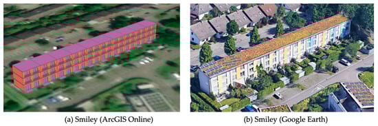 The quality of geo-georeferencing was assessed via visual inspection with Google Earth, and the focus was mainly on the location of the converted models. Google Earth provides historical images and 3D city models, which ensure that the accuracy of geo-referencing can be assessed for all buildings, including those historical buildings that no longer exist. The accuracy of elevation is not assessed, out of two reasons: (a) high accuracy digital elevation models (DEMs) required for such assessments are difficult to obtain, and (b) the elevation of models can be easily adjusted in 3D GIS environment. Figure 12 shows the geo-referenced building model on ArcGIS Online (http://arcg.is/1DTfX0, accessed on 20 March 2021), which indicates an accurate geo-referencing.