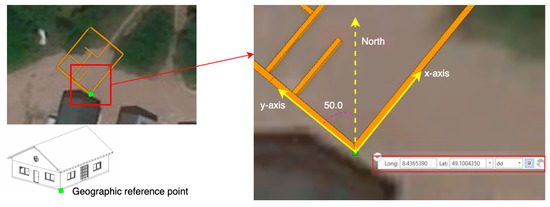 Considering that the purpose of validation is to make sure that the proposed method can place BIM models at the designated locations (i.e., the location defined by the geographic reference point in IfcSite) and orientations, models with an incorrect spatial reference can also be used to validate the method. The proposed method can be claimed as valid if it can place models with an incorrect spatial reference at the designated wrong locations. The House 1 model listed in Table 5 was used for this purpose. The House 1 model has a GRP of (8.436539, 49.100435) and true north of (0.76604, 0.64279). The true north value indicates an angle of 50.0 degree between the y-axis and the true north. Figure 13 presents the processed House 1 model, where only walls are displayed for a clear illustration. Figure 13 proves that the proposed method has performed as expected and can place the model at the designated wrong location, and the orientation of the model is correct, with an angle of 50.0 degree between the y-axis and the true north.