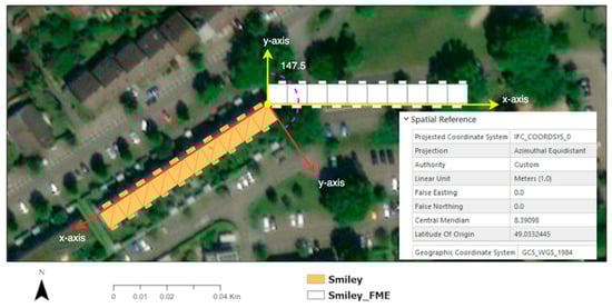 For the Smiley model, from its geographic reference point, (8.390980, 49.033244), it can be determined that this model is located in Germany, where two types of projected CRS are being used, including Gauss–Krueger (zone 2, 3, 4, or 5) and UTM (zone 32 or 33). In this study, WGS84/UTM zone 32N (EPSG: 32632) was selected, as this projected CRS uses the same datum with IFC, i.e., WGS84 [53]. The converted map coordinates for the geographic reference point and the transformation matrix are presented in Table 6.