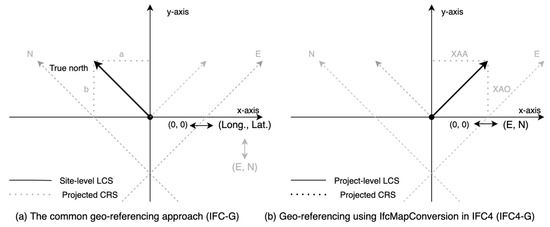 (a) General IFC geo-referencing and (b) IFC4 geo-referencing.