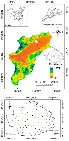The Nanxiong basin is a typical red bed ecosystem with special material, energy, structure and function, which is formed based on red sandstone and glutenite and under the interaction of the atmosphere, water, rocks and organisms [16,17]. In recent years, the aggravation of human activities has exacerbated the land degradation of red bed ecology, generating severe ecological problems such as deserts in the red bed area of southern China [18]. The loss of SOM has become an obstacle to the sustainable development of local agriculture, and the protection of soil environment and land resources. Some publications [19,20,21,22,23] have illustrated that the variation of SOM content is associated with terrain factors (altitude, slope), bulk density, soil pH, etc. However, the research into the influencing factors of SOM spatial variation, focusing on different land degradation degrees, is still lacking and has become a pressing topic. Thus, it is of great significance to explore the spatial variability of soil organic matter and its associated impact mechanism under various land degradation types in the red bed area. As a result, this research uses the ecologically fragile area of southern China as a study area, and investigates the relationship between the SOM content and topographic factors, soil physical and chemical parameters in different land degradation conditions, providing a foundation for farmland utilization, and conservation of soil and water.