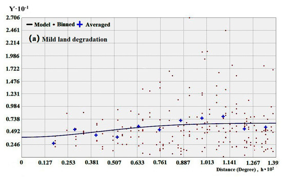 It can be seen from Table 3 that the nugget effect value (i.e., the proportion of spatial variation caused by randomness in the total variation of the system) of SOM under different land degradation types is less than 25%, indicating that there is a strong spatial correlation and that the internal factors play a major role. The impact of terrain factors and soil structural factors on the spatial variation of SOM reaches 89%. The semivariogram model of SOM under different land degradation types follows Gaussian distribution. The SOM level ranged from 2646.57 to 2824.97 m. The sampling design scale of this experiment was 50–300 m, which met the requirements of geostatistics sampling and reflected the spatial pattern information of SOM. Under different land degradation types, the range from large to small was mild land degradation (2824.97) > moderate land degradation (2805.92) > severe land degradation (2769.55) > extreme land degradation (2646.57), indicating that the spatial autocorrelation distance of mild land degradation was large. The second is moderate land degradation, and the autocorrelation distance of extreme land degradation is small. The order of spatial autocorrelation intensity was mild land degradation (10.56%) > moderate land degradation (7.85%) > severe land degradation (7.76%) > extreme land degradation (0.33%). With the increase in land degradation level, the spatial autocorrelation intensity tends to decrease.
