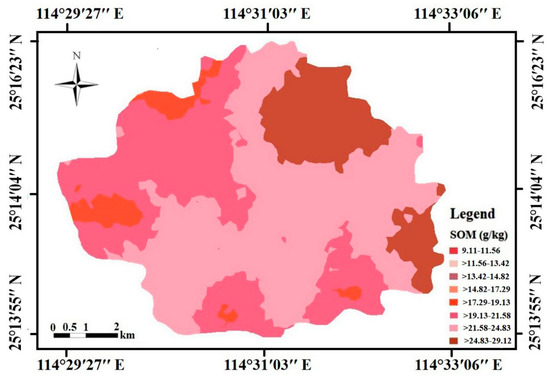 Land degradation is characterized by spatial and temporal scales [35]. The temporal scale can be categorized into small areas, slopes, small watersheds and regions, which have distinct dominant and controlling processes. It is an effective measure to prevent soil erosion and land degradation by constructing terraces under different slopes to optimize land uses. The loss of SOM and other soil nutrients caused by land degradation destroys land resources, reduces land productivity, and aggravates floods and droughts. The increasingly serious land degradation poses a great threat to cultivated land use, soil and water conservation, and has become one of the major global environmental problems [36,37,38]. The Nanxiong basin is an ecologically fragile red bed area in South China with complex topography [16,17,18,31]. If the vegetation and soil layer on the surface of the red bed soil is destroyed, the soft rock of the base red bed will be rapidly weathered and form surface clasts. The precipitation runoff will remove the surface clasts continuously [39]. Gully erosion occurs after the surface is exposed, and new soil layers are difficult to regenerate. With the aggravation and degradation of land, SOM and nutrients are rapidly lost, and desertification occurs eventually with bare bedrock [40,41,42]. In recent decades, a lot of measures have been carried out to prevent and control the soil erosion of cultivated land, and remarkable results have been achieved, though serious problems of soil erosion still exist [17,31]. The spatial distribution of SOM under different degrees of land degradation is closely related to other factors, such as vegetation coverage, investment in soil and water conservation projects, land use, rainfall, and so on.