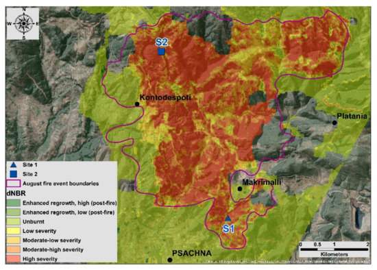 Preliminary research included a first geomorphological study of the burnt area to select a suitable region of interest (ROI). Central Evia area was devastated during recent fires (August 2019), so we assumed that sub-basins within the burnt area would offer an excellent opportunity for soil loss assessment, taking into account the absence of vegetation. Both sites were chosen after applying the Difference Normalized Burn Ratio (dNBR) [57,58,59,60] index to delineate the burnt area by using Landsat 8 pre-fire and post-fire images (Bands 5 and 7), and after using geomorphological and geological data, supported by intensive field work.