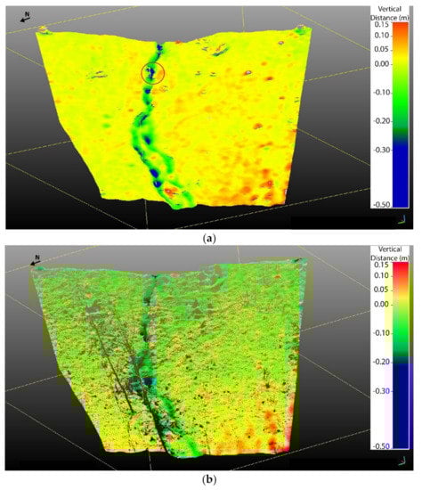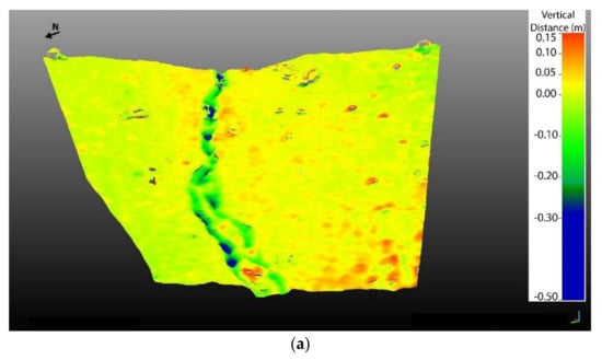 This can be predominantly explained by the vertical angle capture of the photos and the denser point cloud generated by the UAV based photogrammetry, which minimised the shadow effect. Both techniques have advantages and limitations, which should always be taken into consideration when a survey is conducted for the best method to be selected, however, the derived high-quality point clouds appear to simulate the micro-topography and texture accurately. The point cloud analysis comprises a defined XYZ value for every point, followed by an intensity value (TLS method) or an RGB value (UAV method). This type of multi-vector analysis (sphere-by-sphere and point-by-point analysis) is currently a cutting-edge technology with significant potential in several geoscientific applications [13,49,66,67]. As Monserrat and Crosetto [68] indicate, DEM cannot fully represent the complexity of the surface due to the 2.5D data used (there is only one Z-value in a set of X, Y coordinates). Point cloud comparison is considered to be a more accurate procedure during data processing. For this purpose, we decided not to use interpolation during this research, neither to extract TIN data format files, to minimise the corresponding error. Many researchers seem to start utilising the differentiated maps or the M3C2 algorithm and point cloud comparison in landslide detection, flood events, or even in forests’ analysis [14,69,70,71]. There are applications, where high-quality texture reconstruction is needed, as in fault slip rates assessment or signal absorption-based surveys [15,16,17,18,19]. For these applications, the passive sensor of the UAV method is considered inadequate at the moment, and TLS method is widely used instead. The surface vector analysis proposed by Day et al. [61] is considered to be used in our future surveys to be compared with the point- to- point approach.