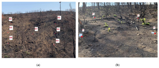Two recently burned slopes were chosen as test sites S1 and S2, located in the Evia island (Greece), near Psachna town (Figure 1a). Both sites are characterised by the same Mediterranean climatic and geomorphological conditions (Figure 1b), and they considered to be suitable for detection of changes over a short temporal timescale, where soil movement was expected to occur. The study areas have relatively steep slopes (mean value: 30°, Figure 1b); they lack vegetation cover due to the recent wildfires and their lithology is susceptible to erosion (Figure 1a). The area of the S1 is about 420 m2 and S2 covers an area of 85 m2. Before the wildfire, both sites used to be covered by coniferous forest combined with a transition of woodland and shrubs (codes 312 and 324, according to the CORINE 2018 dataset). The mean elevation is about 80 m for S1 and 475 m for S2, above sea level. Regarding the site geology, the wider study area is considered to be part of the Subpelagonian unit [55,56]. The geological structure mostly comprises thick Ophiolite formations overlaid by Upper Cretaceous limestone. Under the Ophiolites, a mélange of schist, chert and shales with multiple lenses of limestone occurs. S1 is located within the ophiolitic complex of Upper Jurassic-Lower Cretaceous, consisting of serpentines, diabase and peridotites, covered by a weathered mantle of significant thickness. S2 slope is located within a small sub- basin, comprised of talus cones and alluvial deposits of great thickness. Bedrock geology in both study sites support the formation of significant soil thickness as confirmed by the land cover/vegetation characteristics (Figure 1).