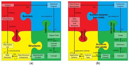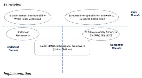 First of all, we remark that we have centered this section on the significant components of the previously presented statistical frameworks. This is so because in the geospatial domain, there is no equivalent global authority to the HLG-MOS, and also because there is a greater tradition regarding the use and development of international standards and adoption of standards from other sectors. The absence of frameworks defined by a global geospatial authority leads us to adopt a different working method in this section than in Section 3. Thereby, whereas in Section 3, a description of the documents that establish frameworks was presented, in this section a search for relevant elements (documents, examples, etc.) must be carried out. In this way, we deduce the implicit existence of parallel frameworks to those existing in the statistical area.