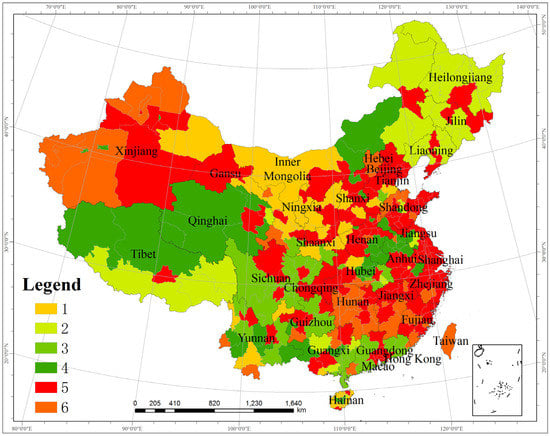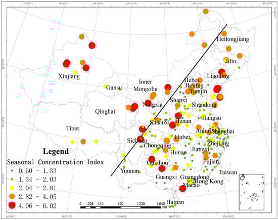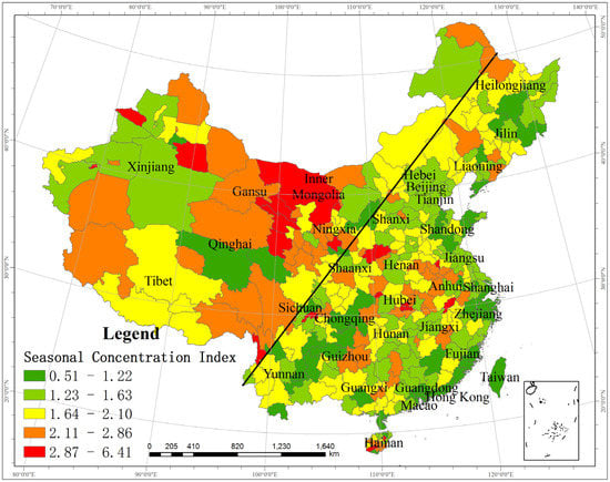With the use of Equation (1), the annual seasonal concentration index of each city is calculated (Figure 2). There are large differences among the various cities. The lowest index value is 0.51 in Ningbo, and the highest index value is 6.41 in Ledong. The overall value of the seasonal concentration index is relatively high, with the values of 109 cities ranging from 1.64 to 2.10, those of 69 cities ranging from 2.11 to 2.86 and those of 22 cities ranging from 2.87 to 6.41. Notable differences are observed on both sides of the Heihe–Tengchong Line. The value of the seasonal concentration index of most cities in the west is high, and the value in the east varies between 1.23 and 2.86.