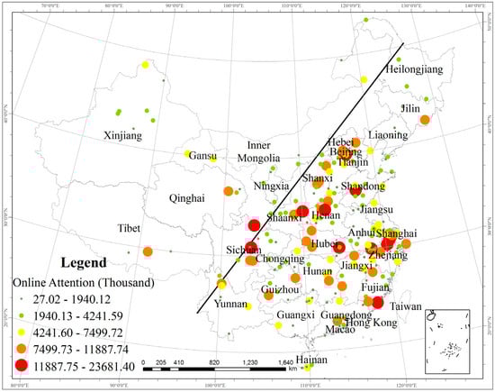 The total volume of the online attention to scenic areas in 2018 was calculated (Figure 3). The total volume of the online attention to the Tu Nationality Park in Huzhu Tu Autonomous County, Qinghai, attains a minimum value of 27,020, while the Palace Museum attains a maximum value of 23,681,400. The latter value is 876 times the former value, indicating obvious differences between these scenic areas. Areas with total volumes exceeding 11,889,800 are largely well-known scenic areas, such as the Palace Museum in Beijing, the Huangshan Scenic Area in Huangshan, the Gulangyu Island Scenic Area in Xiamen, the Shaolin Temple in Dengfeng, Mount Tai in Tai’an, and West Lake in Hangzhou. These scenic areas are very popular in China and worldwide. There are only 44 areas with a total volume of online attention larger than 7,499,800, mainly located to the east of the line, while 160 areas exhibit a volume smaller than 4,241,600, indicating that they generally occur at a low level.
