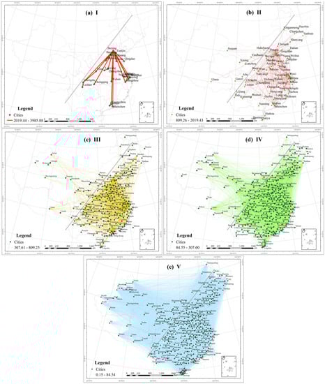 The sum of the average daily volume between any two cities is employed to indicate the association strength of the tourism information flows among cities. The level I area (Figure 5a) includes 24 cities (32 city pairs in total), the level II area (Figure 5b) includes 105 cities (241 city pairs in total), the level III area (Figure 5c) includes 238 cities (1418 city pairs in total), the level IV area (Figure 5d) includes 331 cities (6625 city pairs in total) and the level V area (Figure 5e) includes 364 cities (32,541 city pairs in total). There is a very large difference in the association strength of the tourism information flows among cities. The maximum number of searches is 3985.88 in the Beijing–Tianjin city pair, while the minimum search number reaches only 0.16 in Xuancheng–Macau. Areas I, II and III with a higher association strength are basically distributed on the southeast side of the Heihe–Tengchong Line, among which area I largely occurs in major cities of the different city agglomerations, such as the Beijing–Qingdao, Beijing–Guangzhou, Beijing–Shanghai, Beijing–Jinan and Chengdu–Xi’an city pairs, and in inner cities of city agglomerations, such as Shanghai–Hangzhou, Nanjing–Suzhou, Guangzhou–Foshan, Chengdu–Leshan, and Luoyang–Zhengzhou. There exists a high concordance between their features and the overall development and connection in China. Areas with a lower association strength do not exhibit an obvious geographic differentiation and are widely distributed. Among them, there are 331 cities in area IV and 364 cities in area V. On the whole, the spatial association of the tourism information flows among cities is extremely complicated. Hence, further research is required from the perspective of the network structure.