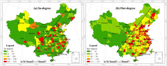 To accurately measure the role of each city in the Chinese tourism information flow network, it is necessary to calculate the in-degree centrality (Figure 8a) and out-degree centrality (Figure 8b) of cities with Baidu. A large difference is observed between the distribution characteristics of the out-degree centrality and in-degree centralities. The out-degree centrality exhibits obvious spatial concentration features, while those of the in-degree centrality are not obvious. Because of the long history, complex topography and unique characteristics of the cultural and natural resources in the different regions, areas with a high in-degree centrality are found in many cities, such as Beijing, Wuhan, Leshan, Aba, Tai’an, Zhengzhou, Jiaxing, Weinan, Hainan Tibetan Autonomous Prefecture, Huangshan, Lijiang, Hangzhou, Jinzhong, Lhasa, Suzhou, Xiamen, Chengdu, Xi’an, Xinzhou, Ji’an, Anshun, Yichang, Yanbian, Shiyan, Jiujiang, Nanping, Tongren, Shennongjia and Luoyang. These cities contain abundant tourism resources and tourist attractions, thus attracting more tourists. Cities with an in-degree centrality of 0 widely occur and are observed in every province, which further indicates that high-quality tourism resources in China are mainly concentrated in a few cities, and most cities in China contain relatively poor tourist attractions. As mentioned before, the out-degree centrality exhibits obvious spatial concentration features, where the out-degree centrality on the east side of the Heihe–Tengchong line is higher than that on the west side. Cities such as Beijing, Shanghai, Shenzhen, Guangzhou, Hangzhou, Suzhou, Chengdu, Nanjing, Wuhan, Xi’an, Changsha, Tianjin, Hefei, Shenyang, Jinan, Chongqing, Zhengzhou, Qingdao, Dongguan, and Nanning attain higher out-degree centrality values, which indicates that these cities comprise the core of the network and impose the greatest regional influence, thus reflecting that there exists a high tourism demand and an advanced development level.