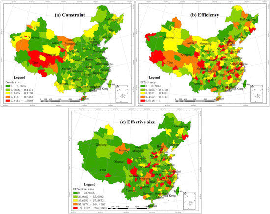 This study considers effective size, efficiency and constraint to measure the structural holes of the network (Figure 10). Cities such as Beijing, Lhasa, Wuhan, Zhengzhou, Leshan, Hangzhou, Lijiang, Suzhou, Tai’an, Huangshan, Xiamen, Chengdu, Jinzhong, and Xi’an attain high effective size and efficiency values but low constraint values, which indicates that these cities are less affected by other cities. Hence, these cities occupy a favourable position in the entire network, with advantages in terms of their location and influence. Cities such as Dongfang, Shannan, Chengmai, Changjiang, Hotan, Wenchang, Wanning, Qamdo, Jinchang, Lincang and Gannan exhibit low effective size and efficiency values and high constraint values, demonstrating that these cities are more affected and thus strongly depend on other cities. Therefore, these cities must enhance their connection and cooperation levels with other cities. Cities with numerous structural holes are mainly located at core positions with abundant tourism resources and a notable superiority, whereas cities with a few structural holes largely occur in regions with relatively low economic and transportation development levels, such as Hainan, Tibet, Xinjiang, Gansu and Inner Mongolia.