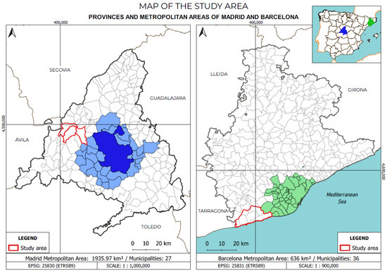 Location map of the metropolitan areas of Madrid and Barcelona and study areas where the methodology was tested in detail.