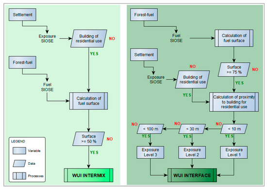 For the detection of areas that are prone to being affected by fires in WUI zones, we decided to consider the terms intermix and interface, set by Stewart, S.I. et al. [30], but with the criteria adapted to the Spanish institutional data sources [24], which allow us to identify the SIOSE polygons that are in a situation of intermix and interface (Figure 2). The definition of intermix corresponds to polygons with a minimum of 50% of forest surface in which there are scattered residential buildings. Interface zones include polygons with dwellings, which are closer than 100 m to polygons with at least 75% of the forest or fuel surface. In this way, polygons with forest tree cover attributes (coniferous, hardwood deciduous, evergreen and scrub) and building coverage (isolated building, building between party walls, single-family isolated dwelling, single-family semi-detached dwelling) were selected.