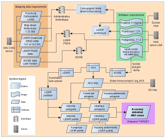 In this study, SIOSE LULC polygons were integrated with LiDAR point clouds in a PostGIS Geodatabase (PostgreSQL), and logical statements on SIOSE were used to determine the “target zones” where forest-fuel and buildings coexist or are close to each other. The resulting polygons constituted a geometrical filter to reduce the amount of LiDAR data needed for processing and, in addition, we resorted to the use of a library specializing in point cloud processing, Point Cloud Library (PCL), the creation of patches and clustering techniques. This allowed us to apply a processing model capable of being run in conventional computers in order to make it easily applicable to fire prevention in urban–wildland interfaces in any part of the Spanish territory. The reason for resorting to LiDAR data is the lack of geometric accuracy of the SIOSE LULC database, with a thematic richness that exceeds the spatial limit of its polygons and hinders the cartographic determination of the affected buildings (scale > 1:25,000).