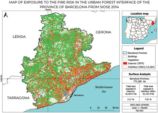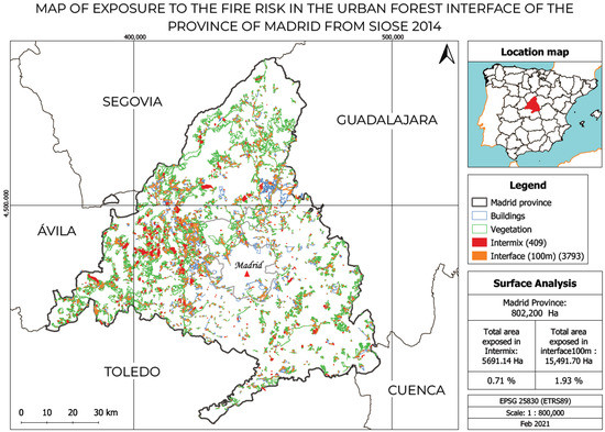 The proposed methodology enabled the automation of a replicable process of calculation and estimation of the built-up areas exposed to fire risk, at a scale of detail appropriate for any urban planning work, estimating which areas are the most exposed to risk, and is applicable to accelerated urban expansion dynamics, such as the case of Barcelona or Madrid. The data sources are open, standardized and regularly updated, thus responding to a public interest, due to the impact generated by the exposure to fire risk on the safety of people and real state in the study zones. Updates allow for chronological monitoring of the phenomenon, as the official geographic information repositories are renewed.