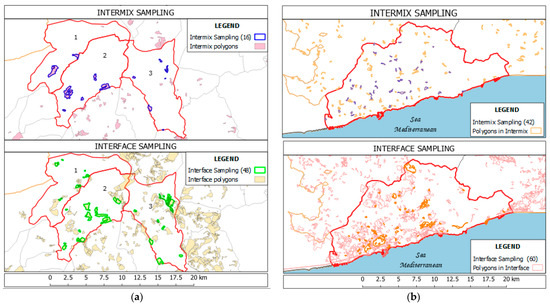 (a) Sample distribution of intermix polygons (SIOSE 2014) in municipalities of Madrid (1—San Lorenzo de El Escorial, 2—El Escorial, 3—Galapagar). (b) Sample distribution of intermix polygons (SIOSE 2014) in the Garraf region.