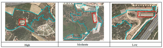 Based on the samples analyzed for the evaluation of the situation of intermix and interface with SIOSE, it was decided to develop sheets to assess, verify and plot the polygons concerning the sources mentioned above. In order to further refine the results, three levels of exposure (high, moderate, low) were established, as seen in Figure 7, which will be compared against the results of the operations performed with the LiDAR data. The high exposure value indicates dwellings that, in the event of a fire, would be totally compromised. The moderate value indicates dwellings that could be affected by fire to a lesser extent, due to their distance from the fuel. The low value indicates dwellings that coexist with the fuel but, due to the limited presence of forest mass or to their greater distance from it, would be affected by a fire to a lesser extent than in the previous situations.