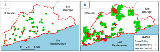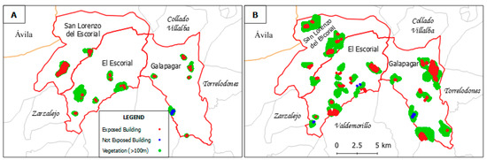 It can be pointed out that, for the Garraf region, where the urbanistic model is based on tourism and expansion derived from second homes, the sampled results showed that the assessment was correct for between 85% and 95% of the cases (Table 3), while for the municipalities of Madrid, it was correct for between 95% and 100% of the cases. In addition, there is a differentiated exposure between the study zones because in the municipalities of El Escorial, Galapagar and San Lorenzo del Escorial, there is a larger number of isolated houses that are in contact with forest and silvopastoral areas, whereas the exposure in the Garraf region mostly affects more consolidated housing areas that coexist with an abundance of fuel. However, the sampling indicates that the methodology applied is effective in identifying exposure and that it is useful for the territory under study.
