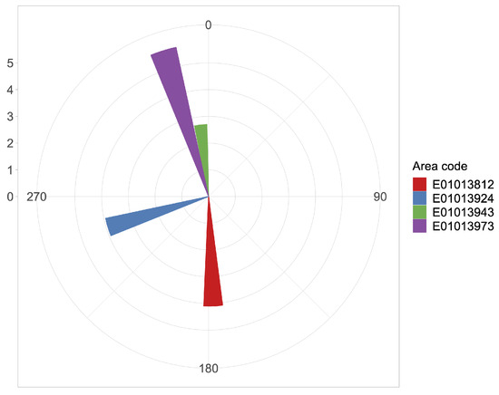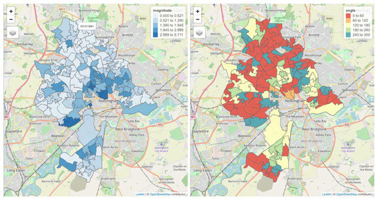 Each variable for each year was transformed to z-scores (i.e., with a mean of zero and a standard deviation of one). The transformed data were used to calculate multivariate angles and distances for the period 2010 to 2016, by modifying the code in the rasterCVA function included as part of the RStoolbox R package [82]. Figure 1 shows these for the Nottingham area, and it was evident that the change (magnitude) was greater around the city centre, but that the nature of those changes as indicated by the direction of angle of the change vector was spatially clustered.