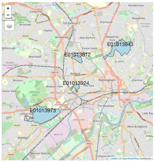 Four example LSOAs in Nottingham, with an OpenStreetMap backdrop.