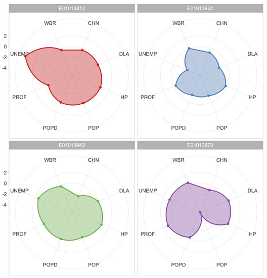 It is perhaps more instructive to examine individual LSOAs. Four were selected, shown in Figure 2, to demonstrate how areas with seemingly similar changes (the vector magnitude) experience different processes, as shown by the vector angle. The rescaled values for 2010 were subtracted from the rescaled values in 2016 for the eight domains used to calculate the change vector, as shown in Table 3.