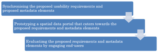 Based on the user-centred design (UCD) methodology [25], previous studies have engaged end-users to understand their view on the efficiency and effectiveness of existing metadata systems. Previous authors have [23] discovered significant gaps and usability issues in terms of spatial data discovery and selection. Building on this, [24] engaged 61 users of various existing data portals to delve deeper into the usability issues. The authors of [24] offered improved design principles for the interface in metadata systems based on the engagement result. This study [24] also provided an extension to the ISO 19115 standard to assist user needs for spatial data discovery and selection.