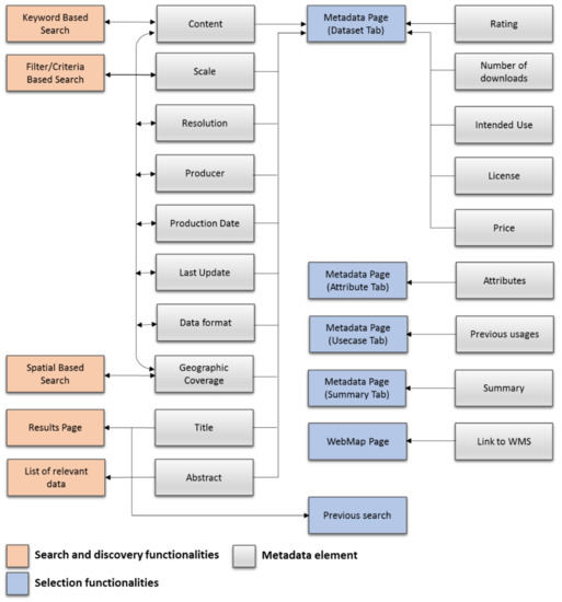 The functionalities of the prototype are divided into two groups by [23]: Search and discovery functionalities and selection functionalities. The search and discovery functionalities are designed to help users find and discover potential spatial data for their projects. The selection functionalities are designed for users to select data based on their suitability to the users’ projects. Each functionality is related to one or more metadata elements in [24] as mapped in Figure 1. This mapping ensures that the metadata elements and user requirements are consistent and in concert before the prototype development starts.