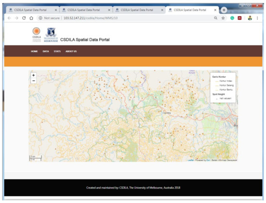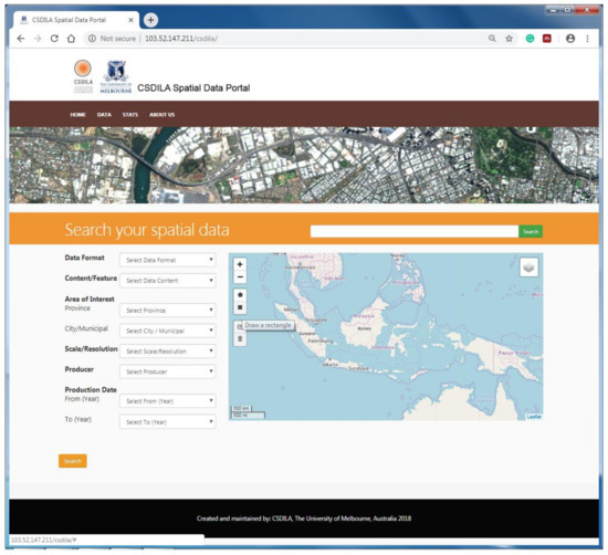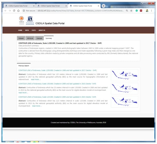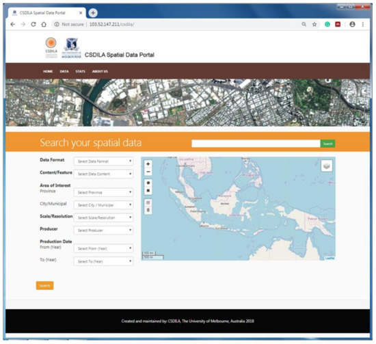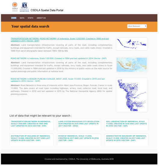 The spatial data available from the Indonesian Spatial Data Infrastructure was selected for the purpose of prototyping. The selection of the spatial data is based on two criteria: Open access to spatial data and its services and a variety of themes. The prototype is implemented as a web portal that selected spatial data users can use for evaluation. The prototype consists of four main pages: The search page (as the homepage), the search results page covering the data search and discovery functionalities, the dataset metadata page (with tabs) and the web map service page covering data selection functionalities.