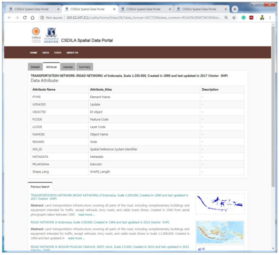 The next tab provided as part of the metadata page is the attribute tab. It contains information about the spatial data attributes in a tabular format that might assist users in getting to know the contents and structure of the data. A previous search window is also provided below the main attribute window similar to the dataset tab, as illustrated in Figure 7.