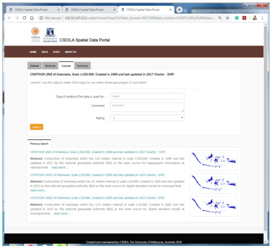 Figure 8 illustrates the usecase metadata page, a tab that provides users with information about the previous usages of the data. In this tab, users can give their own experiences with the data by submitting reviews into a form. The previous search window is also provided on this page.