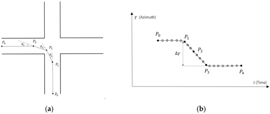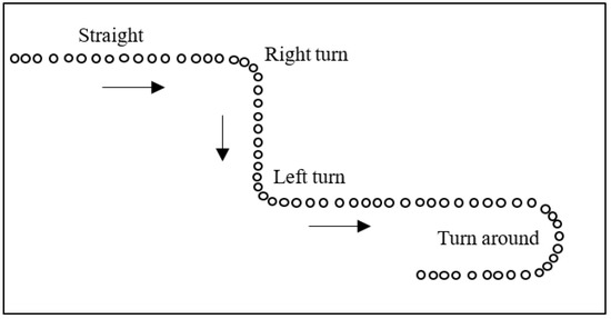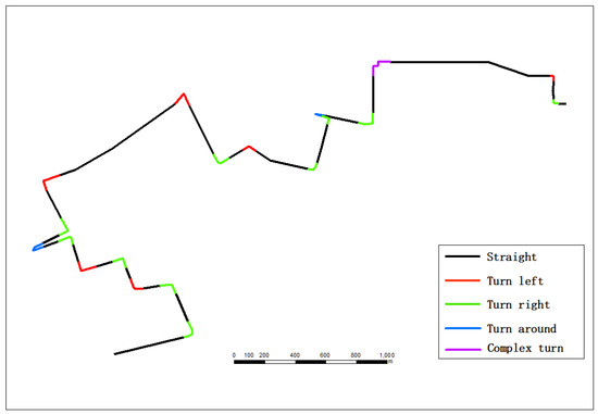 The proposed algorithm makes an important assumption: the cycling trajectory collected and shared by individual providers should completely comply with traffic rules, and thus there should be no traffic violations, such as retrograde, etc. Cycling trajectory-based navigation requires the extraction and sharing of important traffic information from a given cycling trajectory, such as going straight, left turn, right turn, turn around, etc. (Figure 1). Although the proposed algorithm does not require the support of road network data, the navigation route provider must carry the smart phone during cycling when collecting trajectory data. The algorithm recognizes and extracts the turning feature points based on the coordinate data collected by the positioning sensor, and subsequently combines the azimuth angle data of the direction sensor to further determine the turn modes, thus generating navigation messages to share with other users. The navigation route users are only required to collect the positioning coordinates of the trajectory via their mobile phone, not the direction data. The user is then able to reach their destination following the navigation messages. Cycling is more unpredictable than driving and is susceptible to numerous interferences. Therefore, a targeted algorithm is required. Moreover, cycling is also more flexible than driving; when the cyclist is found to deviate from the navigation route, they will be prompted to turn and can correct the route at any time. Consequently, the sharing navigation of cycling trajectories is completely feasible in practical applications.