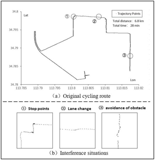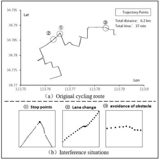 (Cycling Trajectory): The cycling trajectory T is a set of n consecutive positioning points of cycling vehicles (including bicycles, electric bicycles, motorcycles, etc.) in the order of time, namely. Each positioning point(∈0…n) is composed of triples (,,), whereandrepresent the longitude and latitude of the moving object at time, respectively.