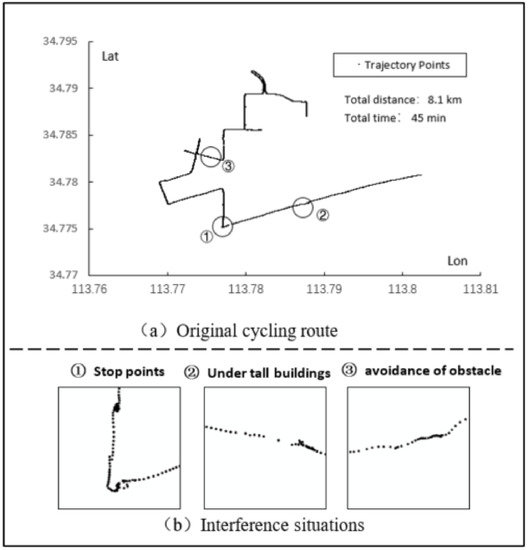 We adopt four types of smart phones to collect four trajectories, respectively (Figure 9, Figure 10, Figure 11 and Figure 12). The collected trajectories all include left and right turns, as well as turning around. Compared with driving trajectories, cycling trajectories are more easily disturbed by various traffic conditions. In order to ensure the representativeness of the experimental data and verify the actual effect of the algorithm, we include several complex traffic conditions during the data collection process. The examples also include various types of interference, such as staying at traffic lights, avoiding obstacles, changing lanes, and cycling under tall buildings or viaducts. Figure 9b, Figure 10b, Figure 11b and Figure 12b are partial enlarged views of the trajectory points in the circle frame of Figure 9a, Figure 10a, Figure 11a and Figure 12a, demonstrating the various interferences in the data collection process of the cycling trajectory.