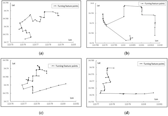 The extraction results of turning feature points under the 5m compression threshold: (a) the first example of cycling trajectory; (b) the second example of cycling trajectory; (c) the third example of cycling trajectory; (d) the fourth example of cycling trajectory.