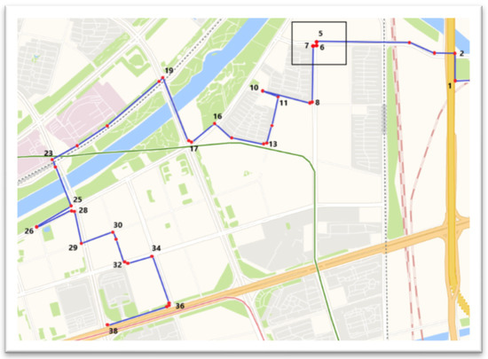 The turning feature points extracted via the compression algorithm based on the trajectory data should be consistent with the real turning points of actual roads. Table 1 reports the extraction of the turning feature points under different compression thresholds. When the compression threshold is set at 5–10 m, the drift and stop points in the trajectory data can be filtered out, while the extracted turning feature points are very close to the real turning points of the actual road. Figure 13 presents the turning feature point extraction under the 5 m compression threshold.