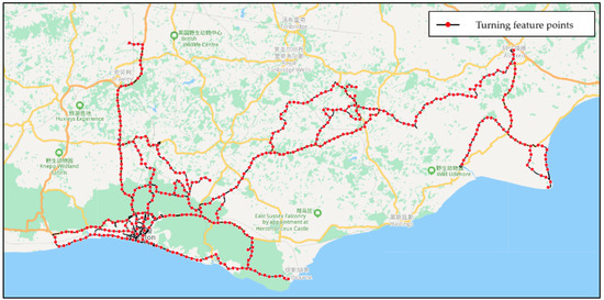 The massive quantities of experimental data come from the Sussex-Huawei Locomotion and Transportation (SHL) Dataset [30,31], from which we chose 50 reprehensive cycling trajectories. The total time of these trajectories is 19.14 h, the total distance is 596.3 km, and the total number of trajectory points is 68,277. Likewise, we use the proposed algorithm to extract turning feature points with the compression threshold set to 5 m. The extraction results are shown in Figure 16 below.