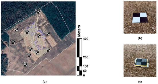 The testing site selected for this study is a quarry in Lithuania, covering the area of 36 ha. The view of the site is provided in Figure 1. Ground-level survey was performed using a Trimble SPS985 GNSS receiver with RTK fixed precision type. A description of this method and details of measurement precision are provided in Section 2.1.1. The drone flights were carried out from different heights: 100 and 74 m. The conventional UAV-ground control based approach was compared with the advanced PPK one known point method. In addition, smaller-scale tests with RTK and under winter conditions with PPK methods were performed. The UAV-based RTK approach is further described in Section 2.1.2., and PPK in Section 2.1.3. Separate UAVs were used for each method: two DJI Phantom 4 RTKs and one DJI Phantom 4 PRO. These drones were selected for the study as quite common and widely used in the industry for mapping purposes. Before the flights, 11 markers were placed and measured in the area to determine GCPs and CHPs in order to scale and check the accuracy of the model (Figure 2a). The markers were manufactured of 60 × 60 cm marine plywood and painted in black and white squares (Figure 2b). Propeller AeroPoints 1.0 base stations were used as markers for the PPK method, along with additional self-made plywood boards, which were used as check points. (Figure 2c).